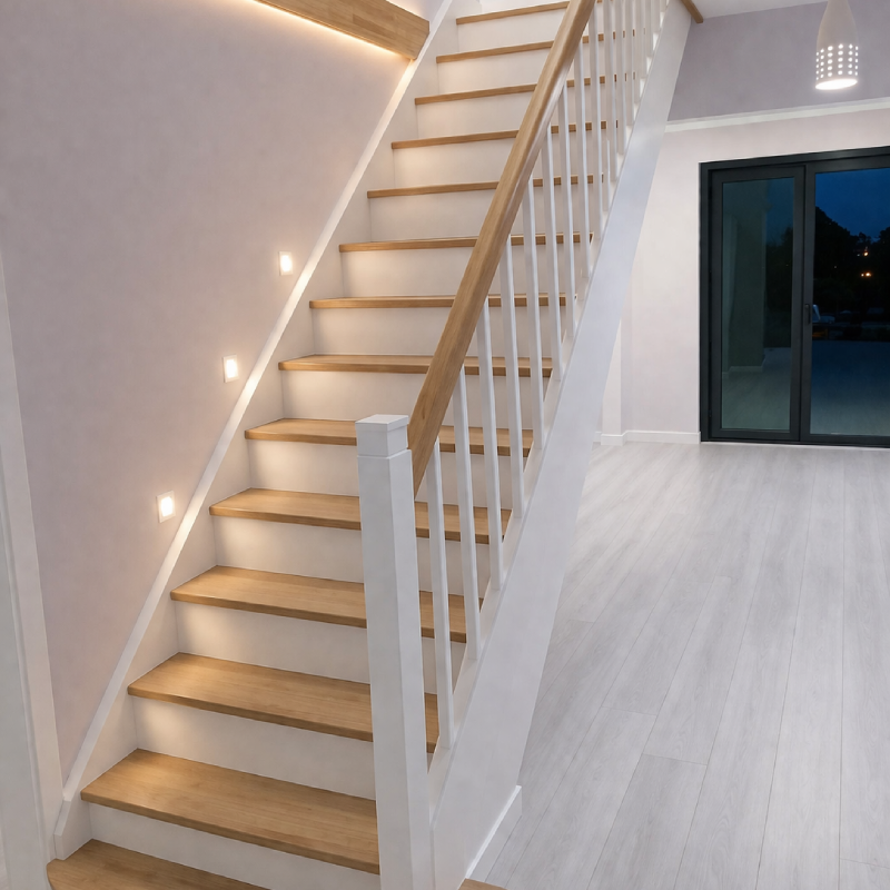 Projede, yüksek dayanıklılığa sahip masif ahşap basamaklar, özel LED aydınlatma sistemi ve cam korkuluk detaylarıyla hem estetik hem de güvenli bir kullanım alanı oluşturuldu.